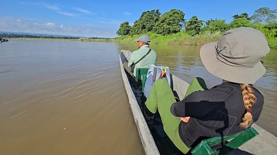 Chitwan est aux frontières de l’Inde, notre destination finale et l’une des dernières zones encore préservées. Réserve naturelle du Népal, où subsistent les derniers rhinocéros gris d’Asie à une corne et les fameux tigres du Bengale. Nous sommes ici pour quelques jours, au programme randonnée et petit safari à dos d’éléphant. Bien installés au balcon de notre hôtel, nous pouvons admirer en cette fin de journée un paysage grandiose, une végétation luxuriante et en toile de fond les premiers contreforts de l’Himalaya. La rivière nous offre un spectacle incroyable, des éléphants viennent se rafraîchir avec leurs cornacs ou un rhinocéros vient se baigner de longues heures, les crocodiles viennent s’échouer le temps d’une longue sieste et tout cela naturellement, comme si depuis la nuit des temps le temps était resté le même.