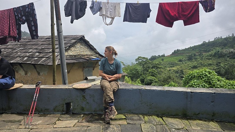 Nous marcherons jusqu’à notre deuxième hébergement, une maison traditionnelle népalaise, deux lits dans une remise dont un sans matelas, remise qui nous permettra de faire une retraite spirituelle toute l’après-midi, sans wifi. À 19 heures, sous une ampoule scintillante, nous dégustons le fameux dal bhat, plat traditionnel et emblématique au Népal. Cela aurait été délicieux si ce n’était que le deuxième de la journée. Comme dirait Charlotte, pissette, couchette. Deuxième nuit de m…. . Il est tombé des cordes toute la nuit, les tôles de notre remise ont fait un boucan infernal.